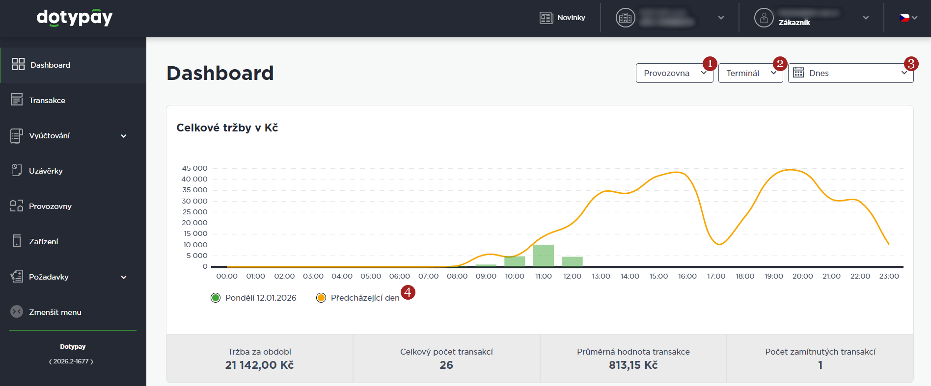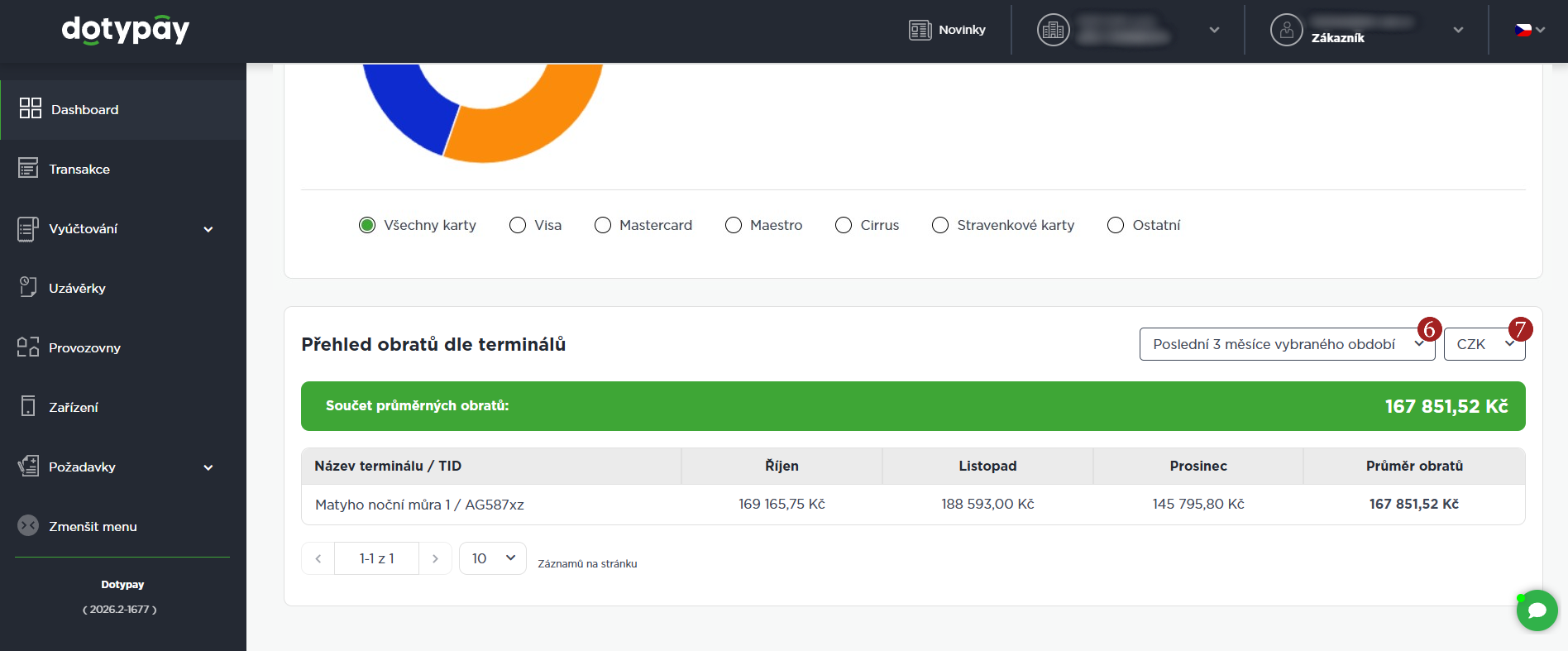 Sekce Dashboard je výchozí sekcí portálu Dotypay. Data z terminálů jsou zpracována a vyobrazena ve 2 grafech – Graf celkových tržeb a Graf typů transakcí. Dále se zde nachází seznam Přehled obratů dle terminálů.