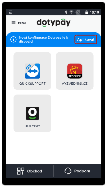 Kliknutím na jednotlivé dlaždice (ikony) na Launcheru, spustíte aplikace. Může se jednat o platební aplikaci (Dotypay), o EET aplikace (Dotykačka a Profi Účtenka) nebo třeba o aplikace sloužící pro vzdálenou podporu (Quicksupport) ad.