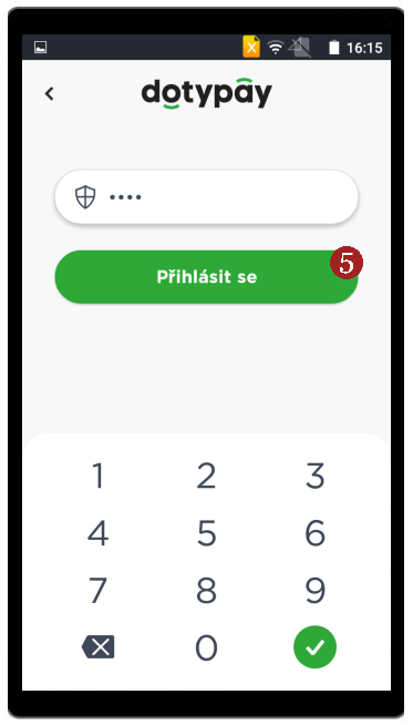 Po kliknutí na 4 Rozšířené nastavení budete vyzvání k zadání PINu. Tento PIN naleznete u Detailu zařízení na portálu Dotypay nebo pro jeho sdělení kontaktuje zákaznickou podporu Dotypay. Po zadání PINu klikněte na 5 Přihlásit se.