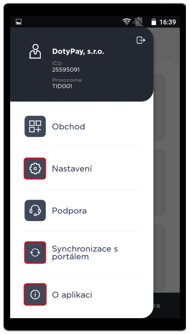 V Podpoře naleznete kontakty a informace o terminálu. V horní části 1 Technická podpora naleznete kontakty na zákaznickou podporu Dotypay. Ve spodní části naleznete parametry terminálu, například 2 IP adresu, kterou využijete pro propojení s pokladními systémy. Pracovníkem zákaznické podpory Dotypay můžete být požádáni o sdělení čísel 3 TID, BID a MID (jedinečné číslo zákazníka, provozovny a terminálu). Pokud je vložena SIM karta naleznete zde také její číslo 4 ICCID.