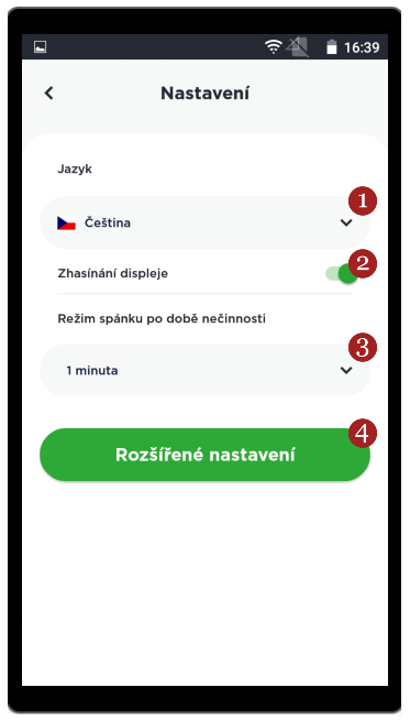 Vstoupit do Nastavení kde můžete zvolit výchozí 1 Jazyk aplikace. Deaktivací funkce 2 Zhasínání displeje (Wake lock) docílíte stále zapnuté obrazovky terminálu nebo si můžete nastavit limit pro přechod terminálu do 3 Režimu spánku (díky režimu spánku vydrží Váš terminál déle nabitý).