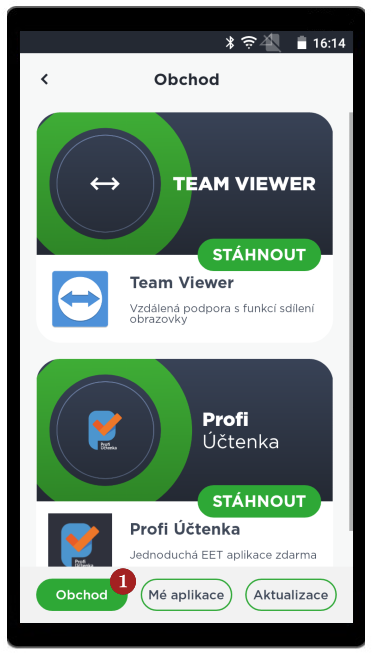 Po kliknutí se zobrazí 1 Obchod s nabídkou aplikací ke stažení. Dále můžete přejít v liště do sekce 2 Mé aplikace, kde naleznete všechny již stažené aplikace, lze je spustit, případně kliknutím na 3 Tři tečky otevřete nabídku k aplikaci. Lze ji odinstalovat, případně nastavit jako výchozí aplikaci (aplikace by se vždy automaticky spustila při zapnutí terminálu).