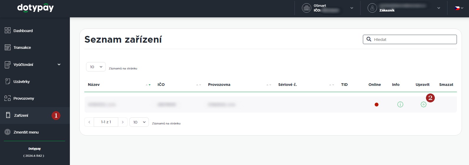 V menu přejděte do sekce 1 Zařízení a klikněte na ozubené kolečko 2 Upravit u terminálu, který si přejete nastavit.