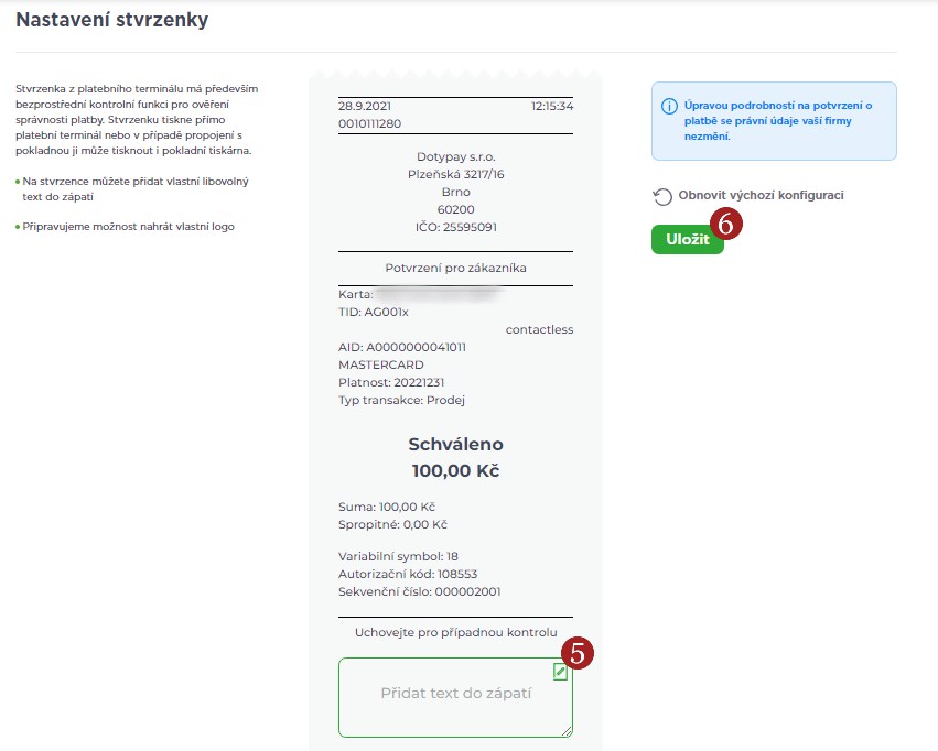 Stvrzenka má kontrolní a informační funkci. Lze na ní upravit zápatí, do kterého je možné přidat libovolný text. Stačí jej vepsat do pole 5 a následně nastavení 6 Uložit.