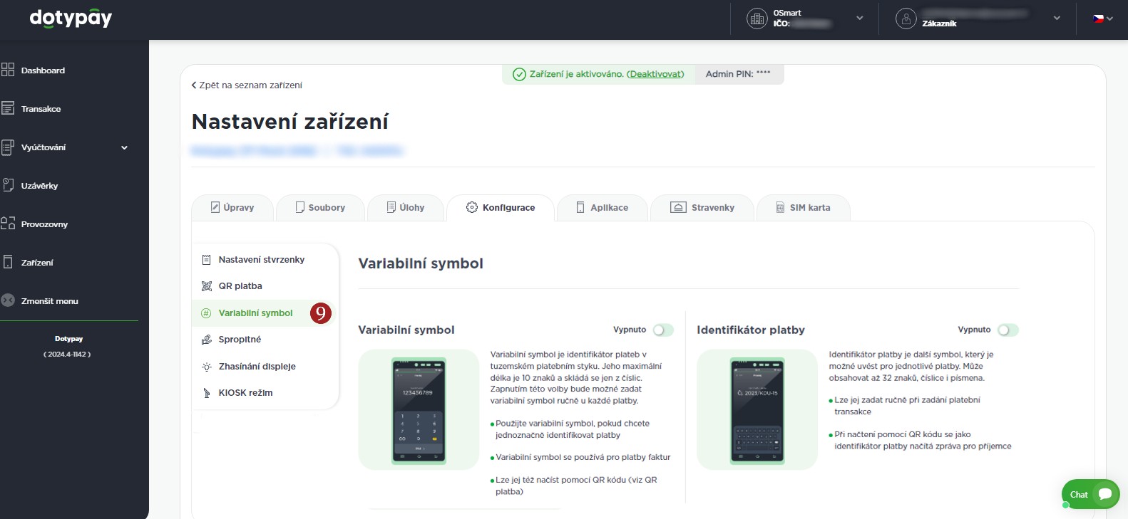 V této části lze aktivovat Variabilní symbol (představuje identifikátor platby, skládá se z číslic o maximálním počtu 10) nebo Identifikátor platby (další symbol, který se může skládat z písmen i číslic o maximálním počtu 32 znaků). Funkci aktivujete přepnutím zatržítka Vypnuto, následně bude možné na terminálu zadávat identifikátor u každé platby.
