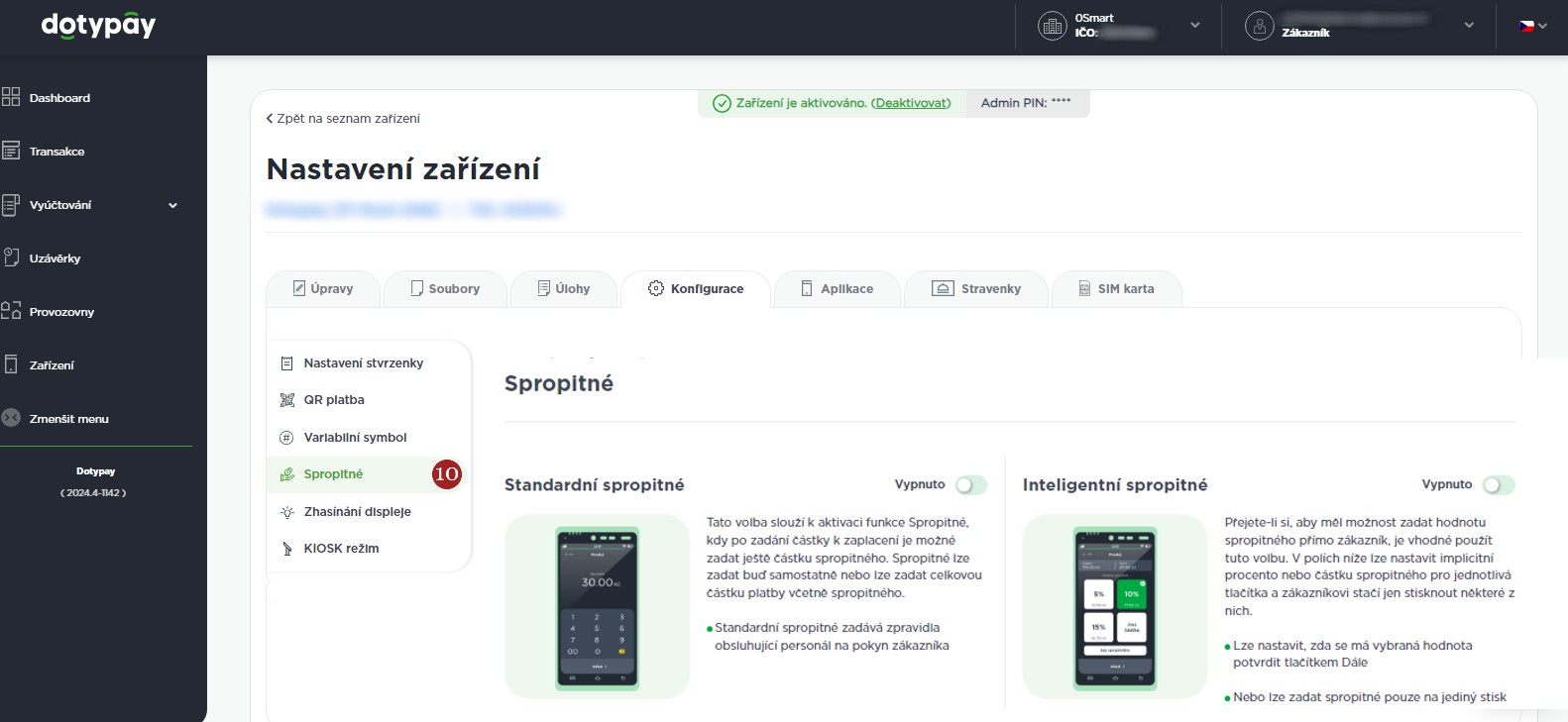 V této části lze aktivovat Standardní nebo Inteligentní spropitné.