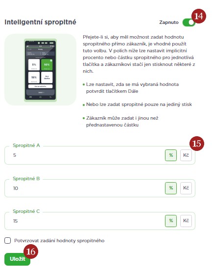 Aktivovat jej lze přepnutím zatržítka 14 Vypnuto. Následně se zpřístupní okna 15 Spropitné A, B, C pro předvolení možnosti. Lze si nastavit kolonky s % nebo v CZK. Volbu stačí potvrdit kliknutím na 16 Uložit.