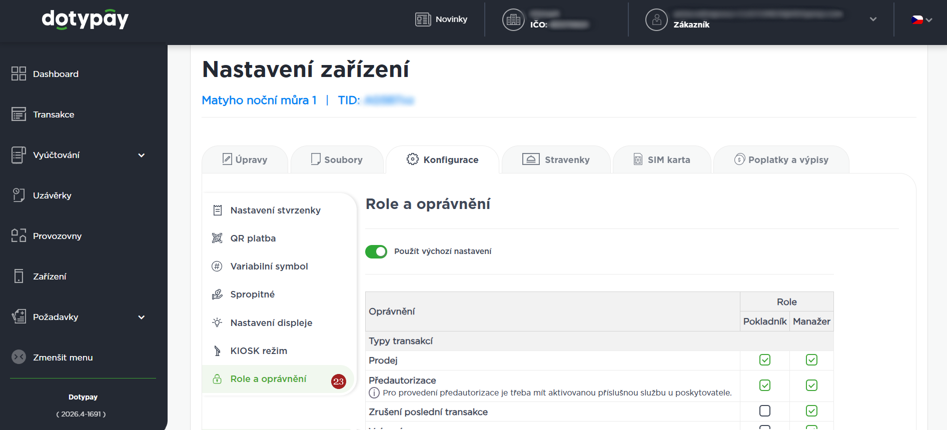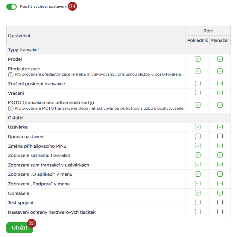V této sekci si můžete přednastavit oprávnění pro jednotlivé role k využívání funkcí na terminálu.