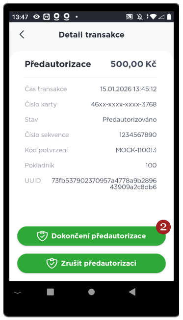 Po kliknutí na Seznam předautorizací se zobrazí seznam všech předautorizací připravených k dokončení, kliknutím 1 zvolte transakci k dokončení. Zobrazí se její detail, kliknutím na 2 Zrušíte předautorizaci.