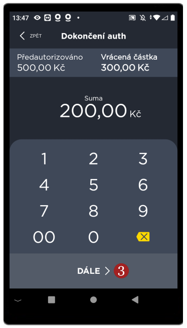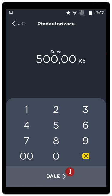 Po kliknutí na Předautorizace, zadejte sumu a potvrďte ji 1 Dále. Rozsvítí se obrazovka s výzvou na použití platební karty k uhrazení sumy (přiložte, vložte nebo protáhněte kartu).