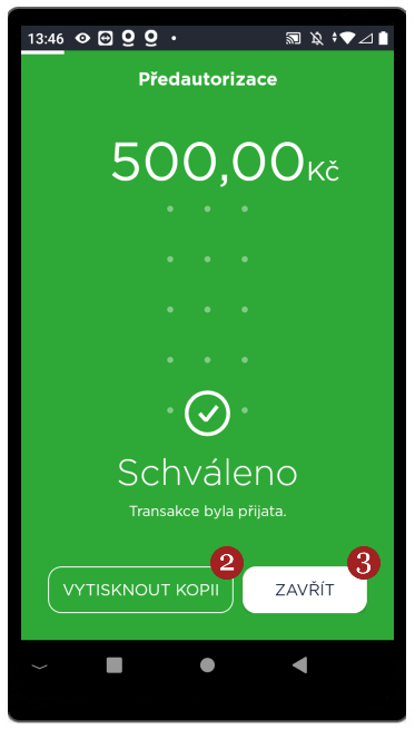 Po několika sekundách proběhne platba a terminál vytiskne stvrzenku o úspěšném či neúspěšném dokončení transakce. Pokud potřebujete vytisknout stvrzenku ještě jednou, využijte funkce 2 Vytisknout kopii. Na hlavní obrazovku aplikace se vrátíte kliknutím na 3 Zavřít, případně vyčkejte, aplikace se automaticky vrátí na hlavní obrazovku (po 10 vteřinách).