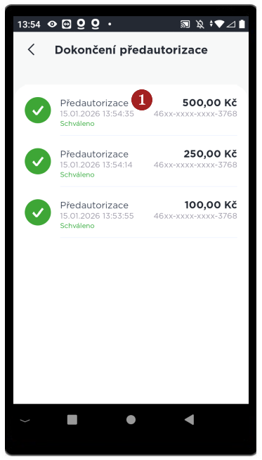Funkce slouží k dokončení před-autorizace za přítomnosti karty. Po kliknutí na Dokončení předautorizace,se zobrazí obrazovka s výzvou na přiložení platební karty (přiložte, vložte nebo protáhněte kartu). Následně se zobrazí seznam předautorizací vytvořených k dané kartě, kliknutím na 1 zvolte transakci.