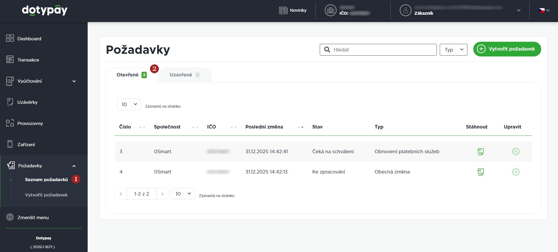 Sekce Požadavky slouží pro jednoduché a přehledné podání žádosti o změnu. Dělí se na 2 části. V sekci 1 Seznam požadavků naleznete seznam všech svých požadavků a jednoduše zjistíte v jakém jsou stavu. Požadavky jsou rozděleny ve 2 seznamech 2 Otevřené a 3 Uzavřené.