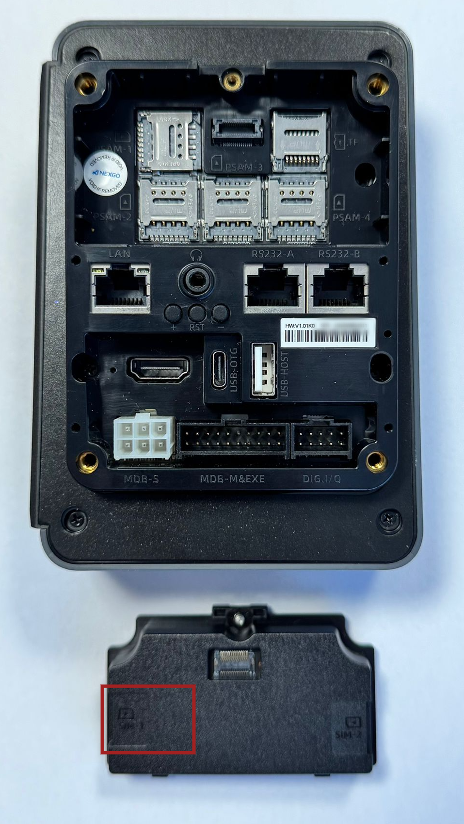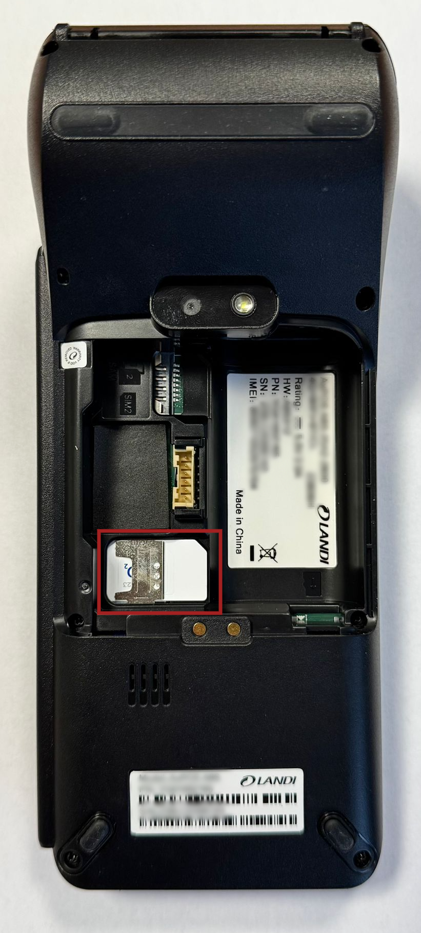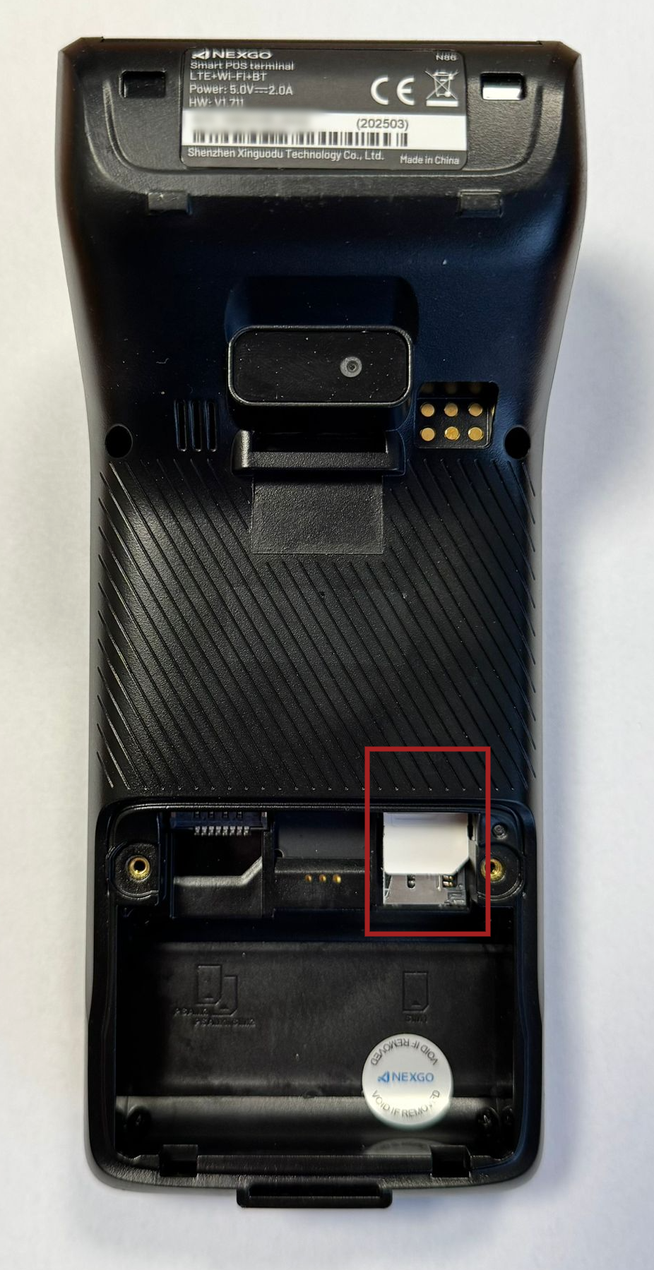 - Vypněte terminál, otočte jej a na zadní straně otevřete kryt.