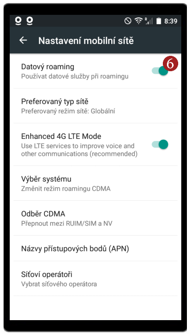 - Povolte 6 Datový roaming.