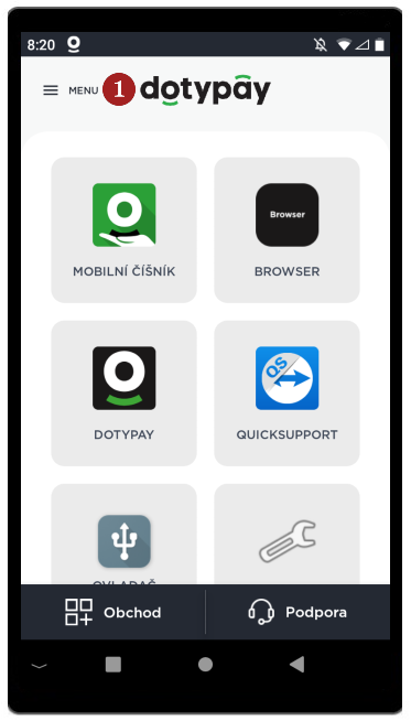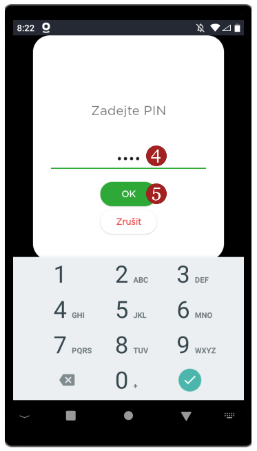 - Zadejte 4 admin PIN (naleznete jej na portálu Dotypay v detailu Zařízení) a klikněte na 5 OK.