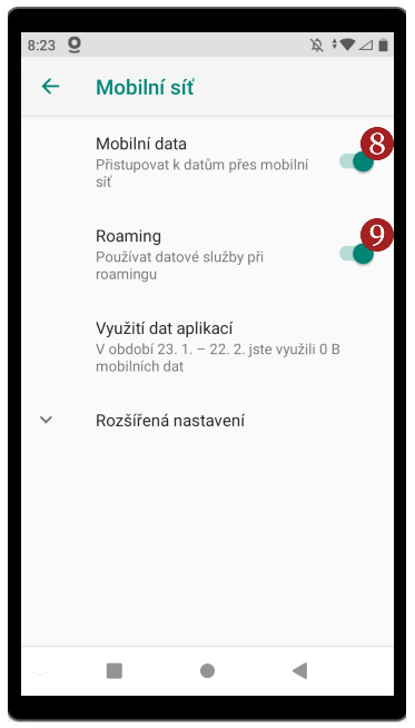 - Aktivujte 8 Mobilní data a 9 Roaming.