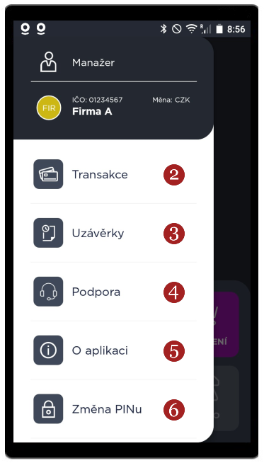 Kliknutím na symbol 3 čar v levém horním rohu se zobrazí 1 Menu aplikace s těmito možnostmi
