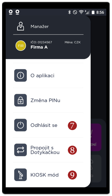 • 9 KIOSK mód – nastavení zadávání plateb jen přes pokladní systém Dotykačka.