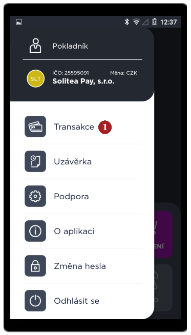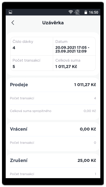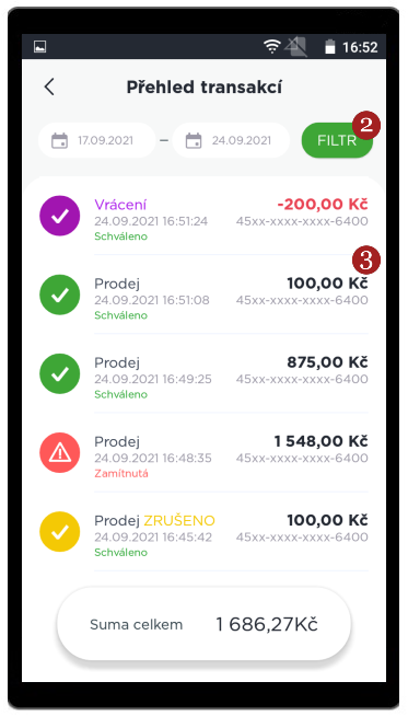 Sekce 1 Transakce obsahuje údaje o všech transakcích, které aplikace zpracovala. Obsahuje také celkovou sumu transakcí za zvolené období, naleznete ji na dolní části obrazovky.