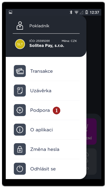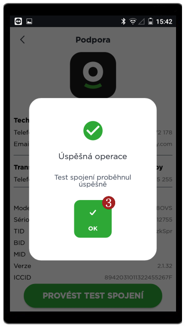 V sekci 1 Podpora naleznete informace o zařízení a kontakty na podporu Dotypay. Také zde můžete 2 Provést test spojení.