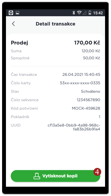 Transakce lze filtrovat dle datumu, pomocí tlačítka 2 Filtr v levém horním rohu. Před kliknutím na toto tlačítko, vyberte datum (od-do). Kliknutím na 3 transakci se zobrazí detail transakce, zároveň si můžete 4 Vytisknout kopii stvrzenky k transakci.