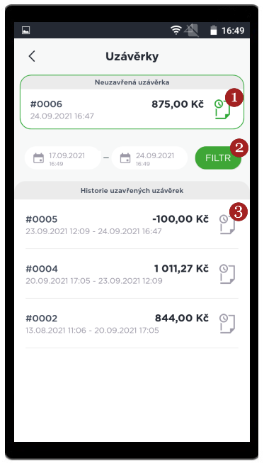 Sekce obsahuje seznam provedených uzávěrek na terminálu. Kliknutím na 1 Neuzavřená uzávěrka se zobrazí detail aktuální uzávěrky, je možné vytisknout si Mezisoučet či Uzávěrku a interval tak uzavřít. Pomocí 2 Filtru lze měnit časové rozpětí pro zobrazení již vytvořených uzávěrek.