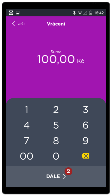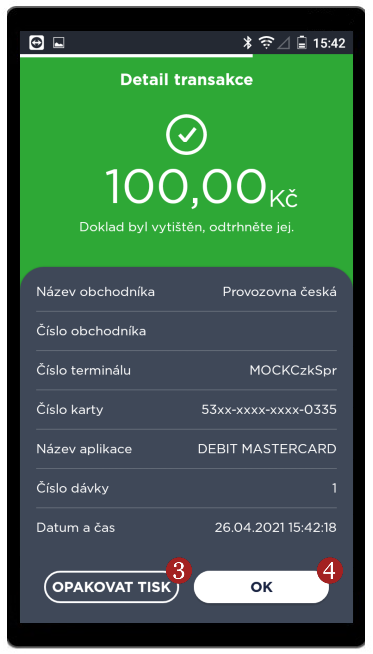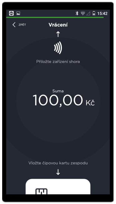 Po kliknutí na 1 Vrácení, zadejte sumu určenou k vrácení a zvolte 2 Dále. Zobrazí se obrazovka s výzvou k použití platební karty (k vrácení sumy na účet majitele karty). Držitel karty ji přiloží, vloží nebo protáhne. Po několika sekundách se vytiskne stvrzenka o úspěšném či neúspěšném dokončení transakce. Pokud potřebujete vytisknout stvrzenku ještě jednou, využijte funkce 3 Opakovat tisk nebo se vraťte na hlavní obrazovku kliknutím na 4 OK, případně vyčkejte, aplikace se automaticky vrátí na hlavní obrazovku aplikace (po 10 vteřinách).