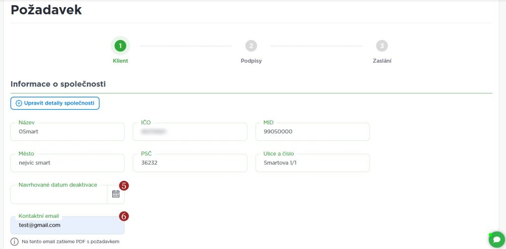 Formulář je částečně předvyplněn. Zvolte 5 Navrhované datum deaktivace a zkontrolujte si 6 Kontaktní e-mail, na který bude zaslán formulář/e s instrukcemi.