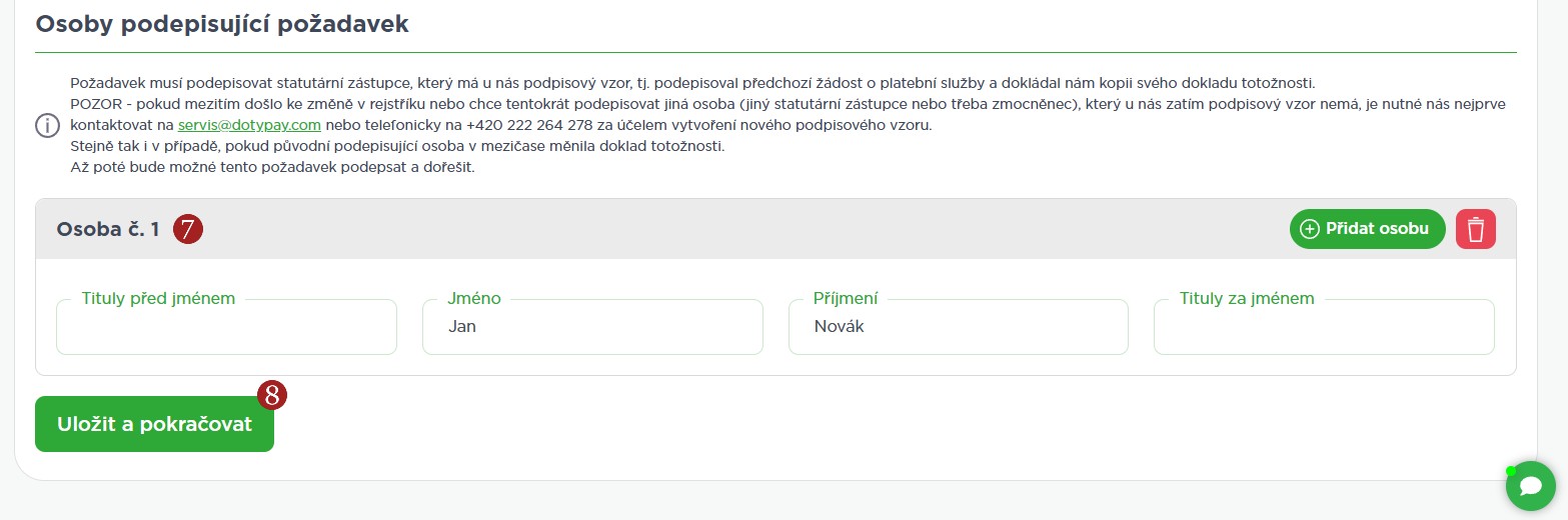 Vyplňte 7 Osoby podepisující požadavek a klikněte na 8 Uložit a pokračovat.