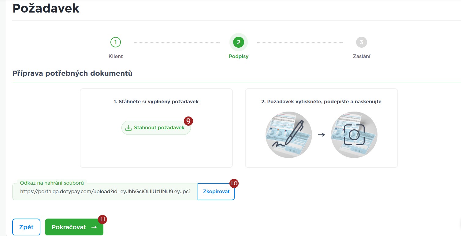 Na zvolený kontaktní e-mail byl odeslán formulář s instrukcemi k obnově platebních služeb. Pokud chcete rovnou pokračovat v podání formuláře, lze jej též stáhnout kliknutím na 9 Stáhnout požadavek a rovnou jej vytisknout. Následně můžete přejít na krok Zaslání kliknutím na 11 Pokračovat. Na kroku Podpisy se nachází také link 10 Odkaz na nahrání souborů.