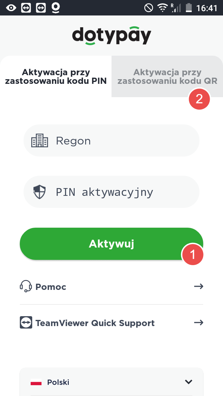 - Pojawi się ekran Aktywacja. Wprowadź swój NIP i PIN aktywacyjny (otrzymane w wiadomości e-mail lub przekazane przez pracownika obsługi klienta Dotypay). Kliknij 1 Aktywuj.