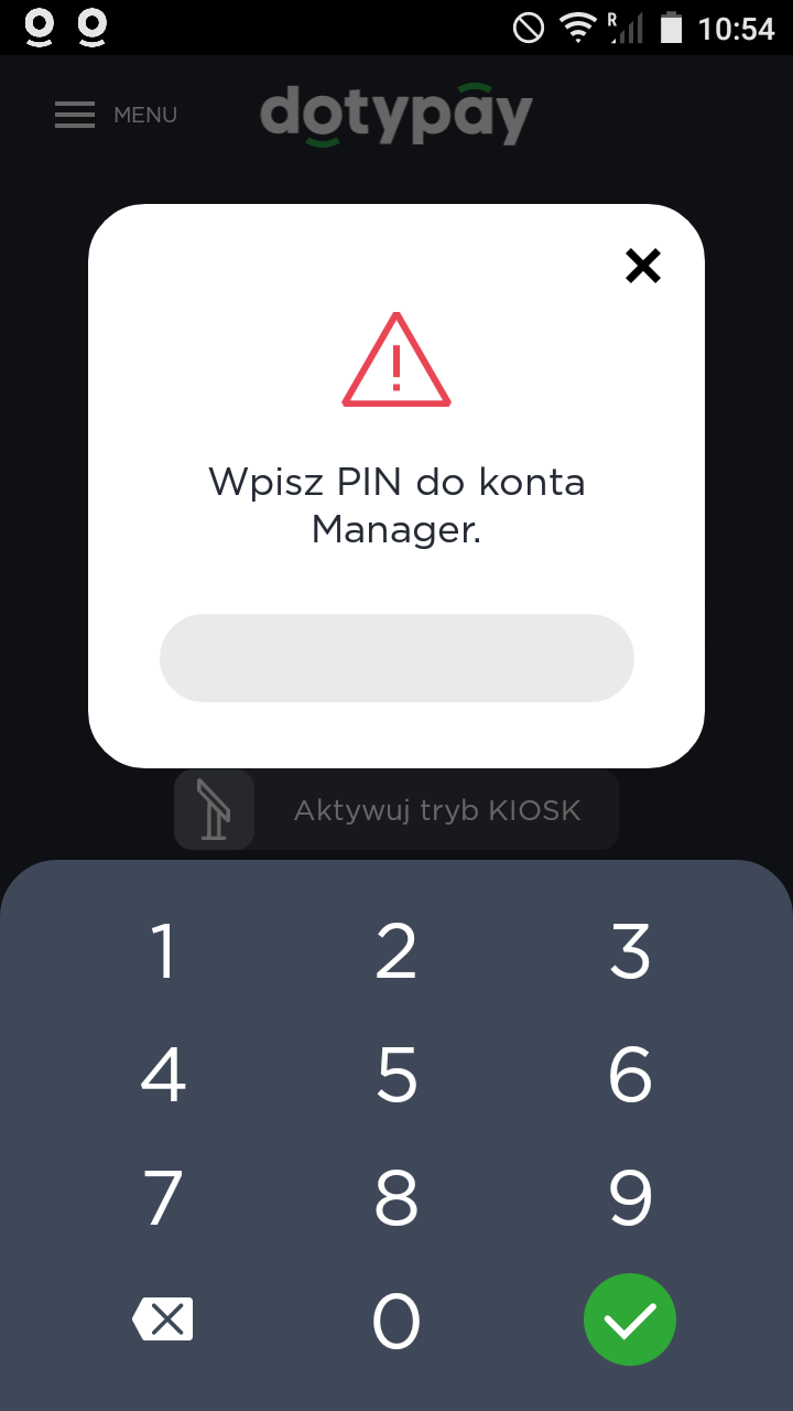 Jeśli jesteś zalogowany jako Kasjer i wybierzesz funkcję, do której nie masz uprawnień, terminal poprosi Cię o wpisanie kodu PIN menedżera.