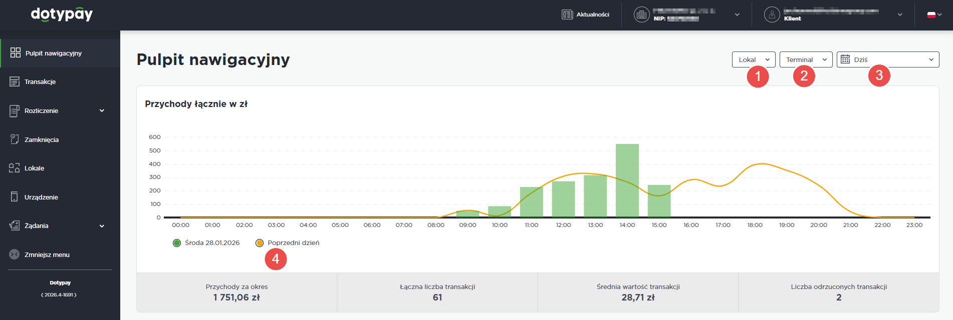 Sekcja Pulpit nawigacyjny to domyślna sekcja portalu Dotypay. Dane z terminali są przetwarzane i wyświetlane na 2 wykresach – Wykres całkowitej sprzedaży i Wykres typów transakcji. Dostępna jest również lista Przeglądu sprzedaży według terminali.