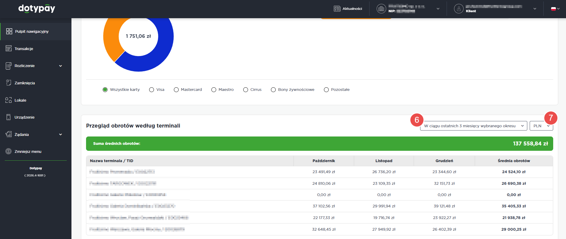 Wyświetla listę Twoich terminali z przeglądem obrotów miesięcznych i średnich obrotów za cały wybrany okres.