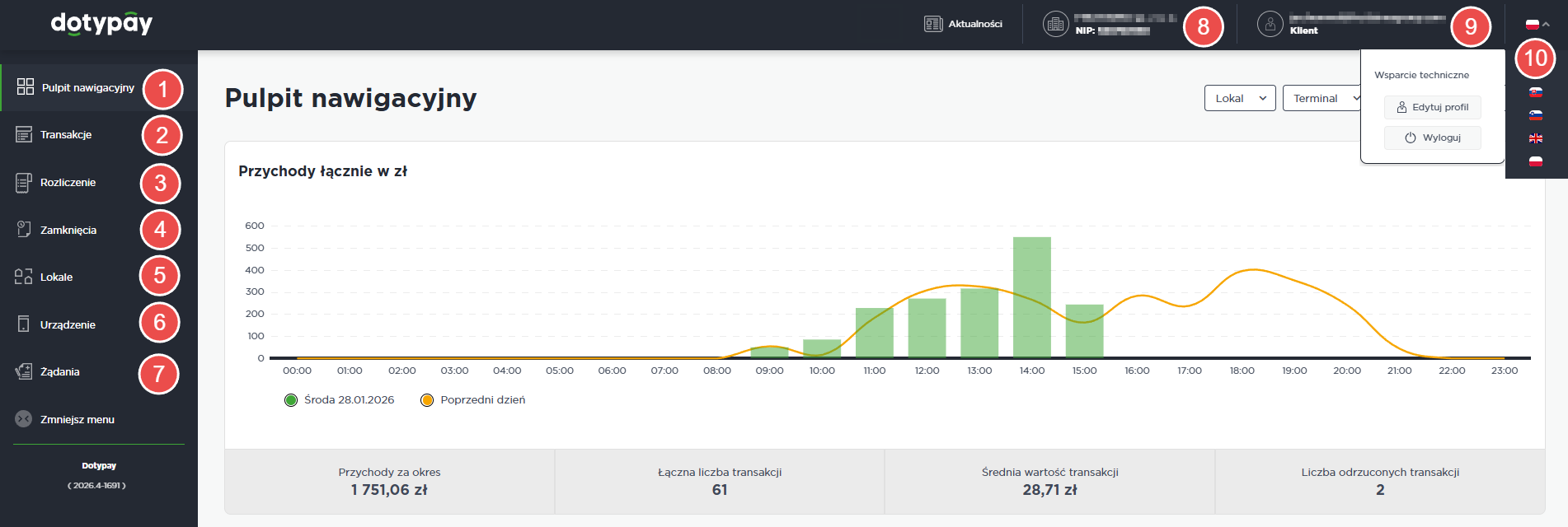 Portal Dotypay oferuje przejrzyste narzędzia do zarządzania terminalami płatniczymi i sprawdzania płatności. W portalu znajdziesz graficzne zestawienia obrotów, szczegółową listę transakcji przeprowadzonych na poszczególnych terminalach, wraz ze szczegółowymi danymi dla każdej transakcji, które możesz wyeksportować do pobrania.