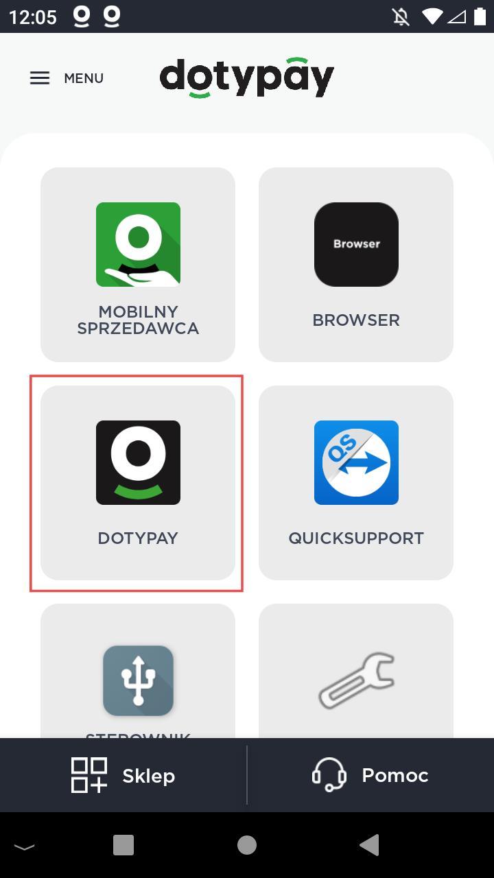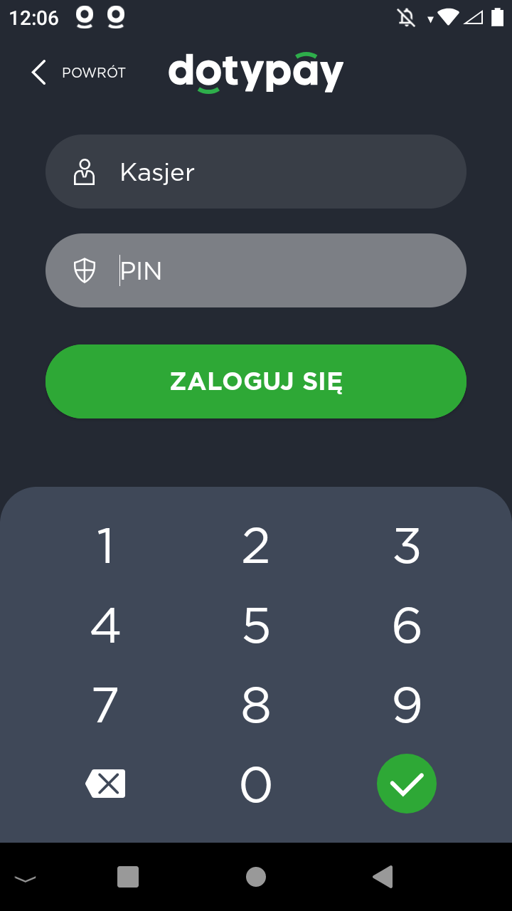 Na ekranie głównym (Launcher) Wybierz aplikację Dotypay. Kliknij Menu (ikona 3 kresek w lewym górnym rogu) i wybierz Logowanie. Wprowadź PIN. Kierownik 1111 i Kasjer 0000.