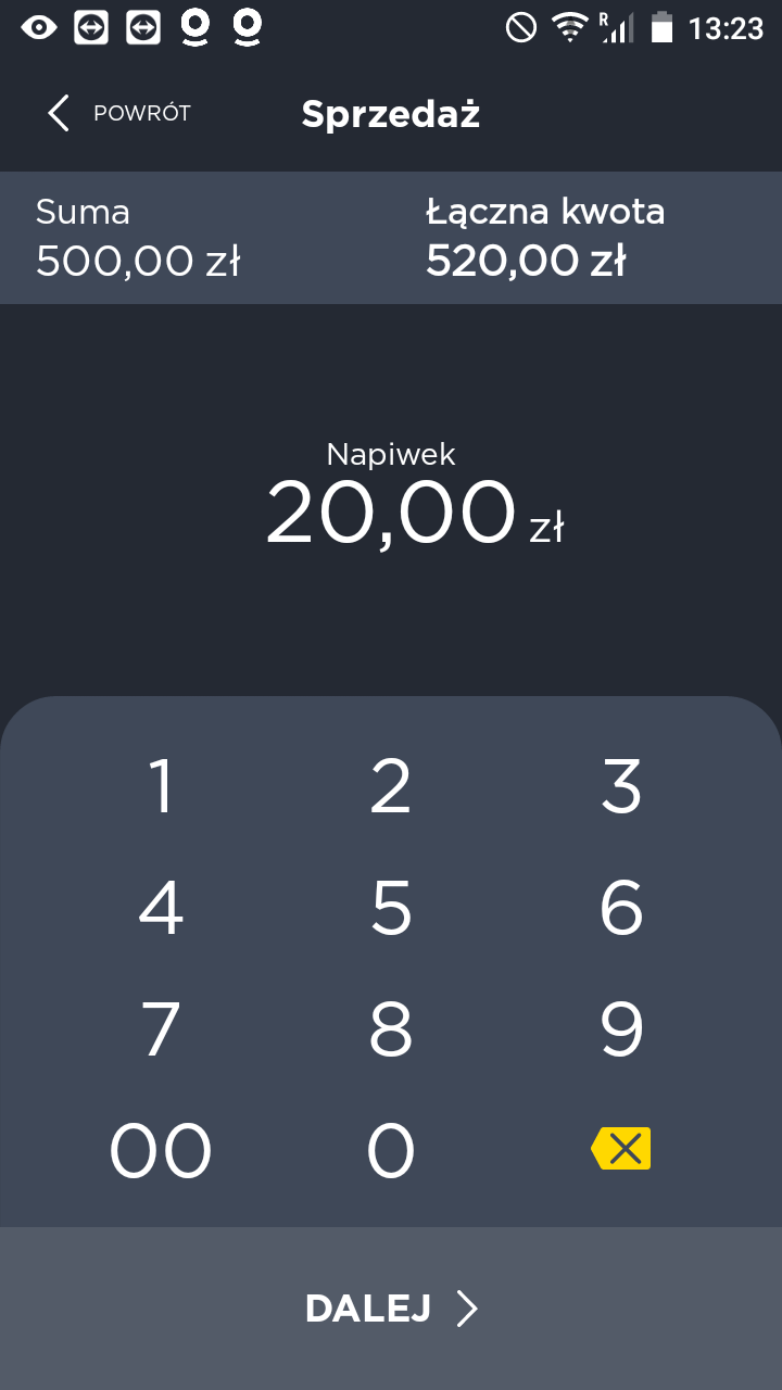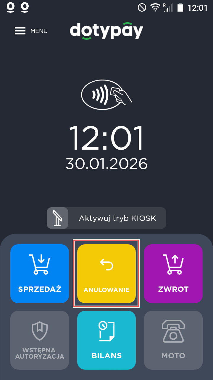Jeśli chcesz anulować ostatnią transakcję, przejdź do aplikacji Dotypay i wybierz funkcję Unieważnienie i potwierdź prośbę o anulowanie transakcji (OK). Jeśli chcesz anulować starszą transakcję, musisz skorzystać z funkcji Powrót (Funkcja ta może być używana wyłącznie przez użytkownika. Menedżer). Wprowadź kwotę do zwrotu klientowi i wybierz Dalej. Klient podłączy lub włoży kartę, a kwota zostanie do niej doliczona.