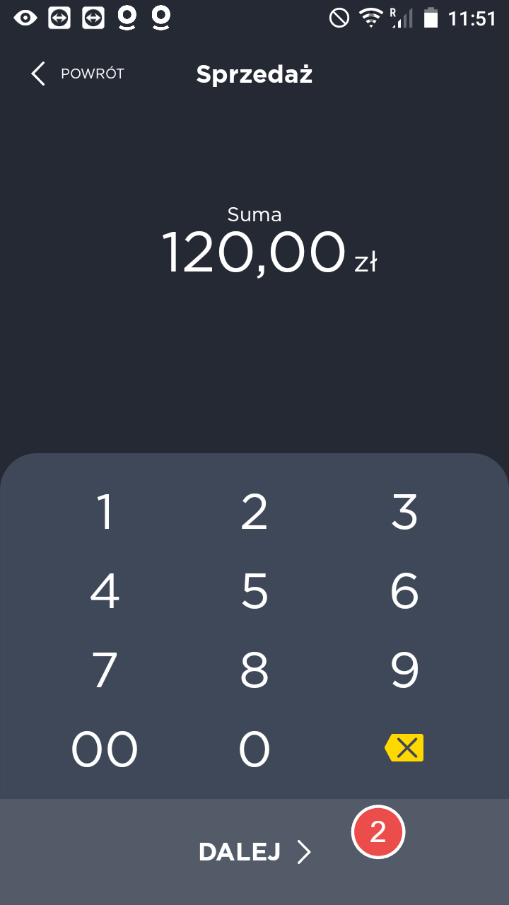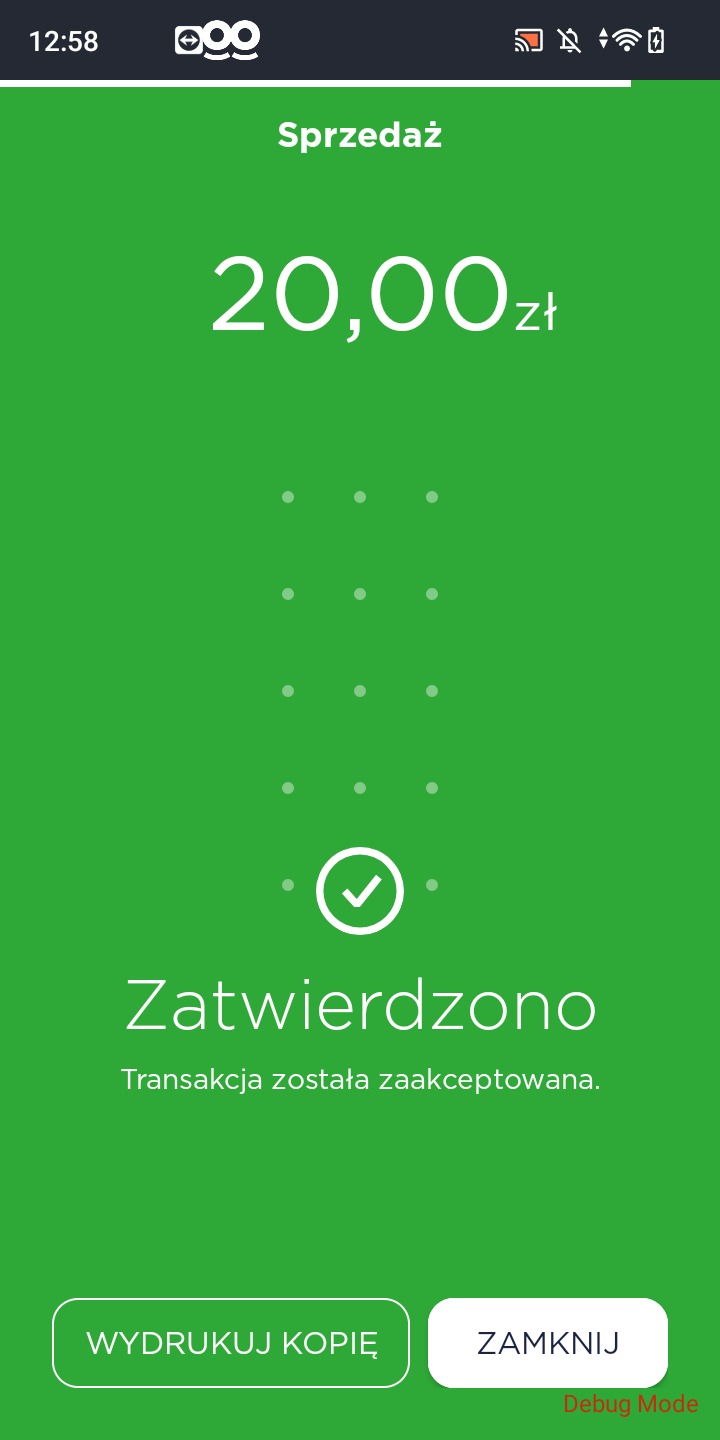 Aby dokonać płatności kliknij na ikonę 1 Sprzedaż, następnie wprowadź kwotę i ją potwierdź 2 Dalej. Jeśli masz aktywną funkcję Napiwek pojawi się opcja wejścia. Niezależnie od tego, czy chcesz dodać napiwek czy nie, kliknij przycisk, aby kontynuować 3 Dalej. Na ekranie wyświetli się prośba o użycie karty kredytowej w celu zapłaty (wykorzystanie jej poprzez użycie karty, włożenie jej do czytnika lub przeciągnięcie). Po kilku sekundach płatność zostanie zrealizowana, a terminal wydrukuje potwierdzenie pomyślnego lub nieudanego zakończenia transakcji. Jeśli chcesz ponownie wydrukować paragon, skorzystaj z funkcji 4 Wydrukuj kopię. Aby powrócić do głównego ekranu aplikacji, kliknij 5 Zamknij, Możesz też zaczekać, aż aplikacja automatycznie powróci do ekranu głównego (po 10 sekundach).