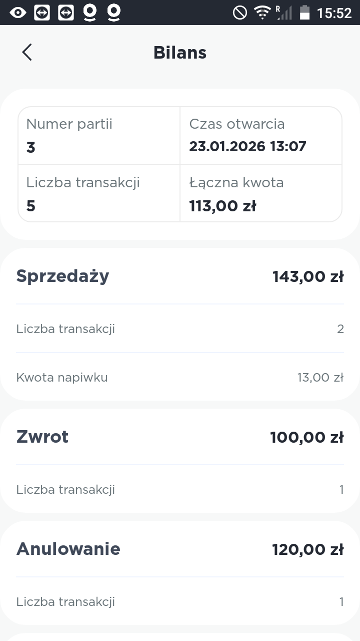 Funkcja służy do wyświetlania bieżącego okresu rozliczeniowego oraz do jego zamknięcia poprzez wykonanie rozliczenia. Po kliknięciu na 1 Bilans Wyświetlone zostaną wszystkie zmiany, które nastąpiły od ostatniego zamknięcia. Znajdziesz tu informacje o sprzedaży, zwrotach, anulowanych płatnościach i napiwkach. Możesz również skorzystać z dwóch funkcji: Suma cząstkowa i Bilans.