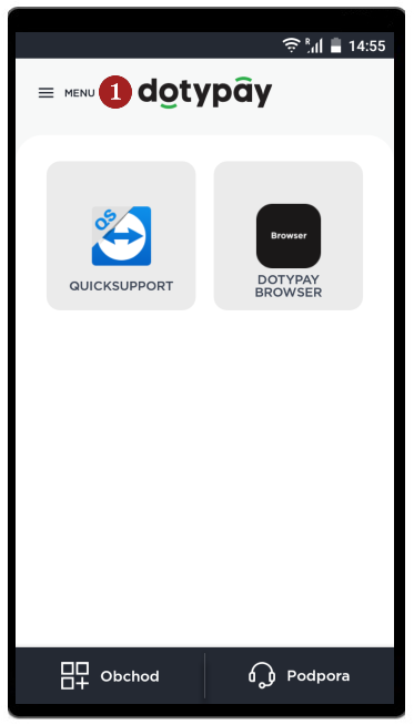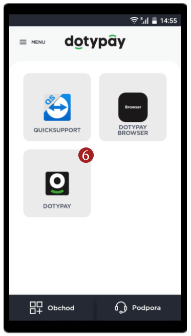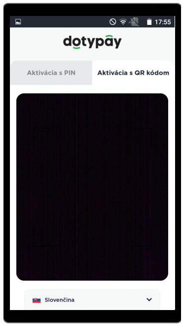 Aktivácia - krok 4- Na aktiváciu je možné tiež využiť QR kód. Po kliknutí na 5 Aktivácia QR kódom, zariadenie zapne kameru, ktorú následne môžete namieriť na QR kód pre aktiváciu, ktorý nájdete na portálu Dotypay v sekci Zařízení.
