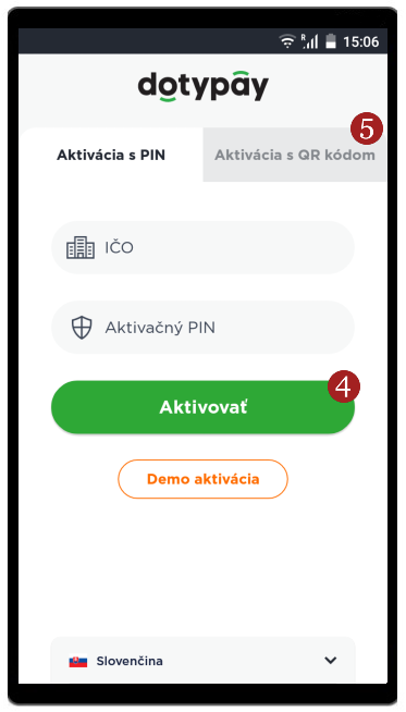 - Zobrazí sa obrazovka Aktivácia. Zadajte svoje IČO a Aktivačné PIN (obdržali ste v e-maile / prípadne Vám ho zdelí pracovník zákazníckej podpory Dotypay). Kliknite na 4 Aktivovať.