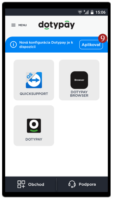 - Zobrazí sa Vám opäť domovská obrazovka Launcher. Medzi ponúkané aplikácie sa pridá ikona Dotypay, vďaka ktorej budete môcť prijímať platby kartou. V hornej časti obrazovky sa objaví informácia o novej konfigurácii, kliknite vpravo na 5 Aplikovať.