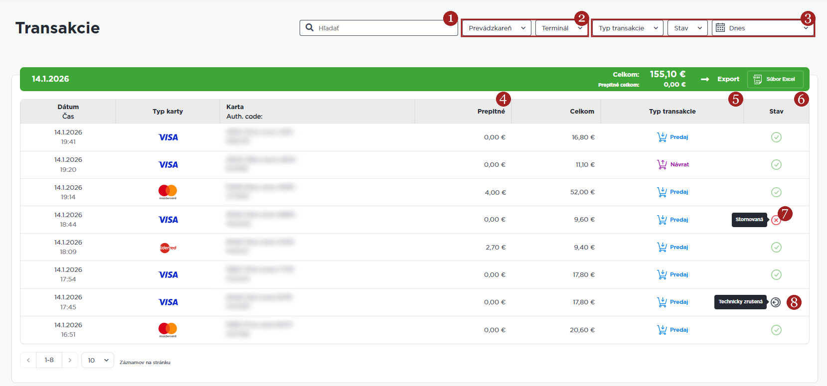 7 Ikona stavu – zelená fajka znamená úspech, červený krížik predstavuje neuskutočnenú transakciu, keď na krížik nabehnete myšou, zobrazia sa podrobnejšie informácie, napr. zamietnuté alebo zrušené.