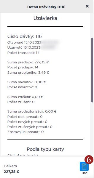 V detaile uzávierky sa zobrazí súhrn prijatých transakcií a rozpis podľa typu karty. Vybranú účtenku je možné kliknutím na 6 Tlač vytlačiť alebo uložiť ako PDF.